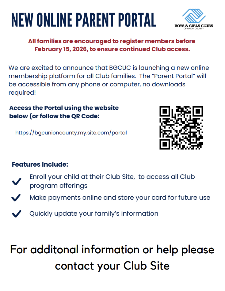 NEW ONLINE PARENT PORTAL Russ Triolo January 28, 2026 Club News, Homepage CLICK LINK BELOW https://bgcunioncounty.my.site.com/portal/s/login/